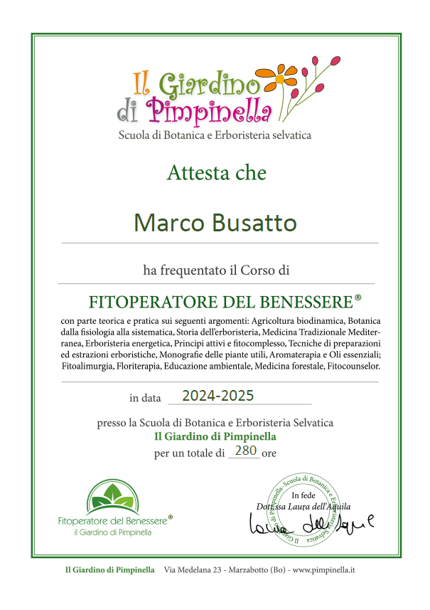 Ho approfondito la Fitoterapia Tradizionale Mediterranea e Indo-Asiatica sia con il percorso Riza, che con viaggi studio in India e Thailandia... sia al Giardino di Pimpinella con Laura Dell'Aquila, che con Leonardo Paoluzzi (medico, e,  agopuntore) con cui ho ben compreso le fondamenta della Fitoterapia Energetica di provenienza Cinese, e, di origine Europea e Mediterranea. Per esperienza personale sono fermamente convinto che la Fitoterapia Energetica, oltre a giungere in aiuto in caso di acciacchi, disfunzioni, malesseri, ecc.. è un salutare e fondamentale supporto al naturale e normale benessere di ogni essere senziente.